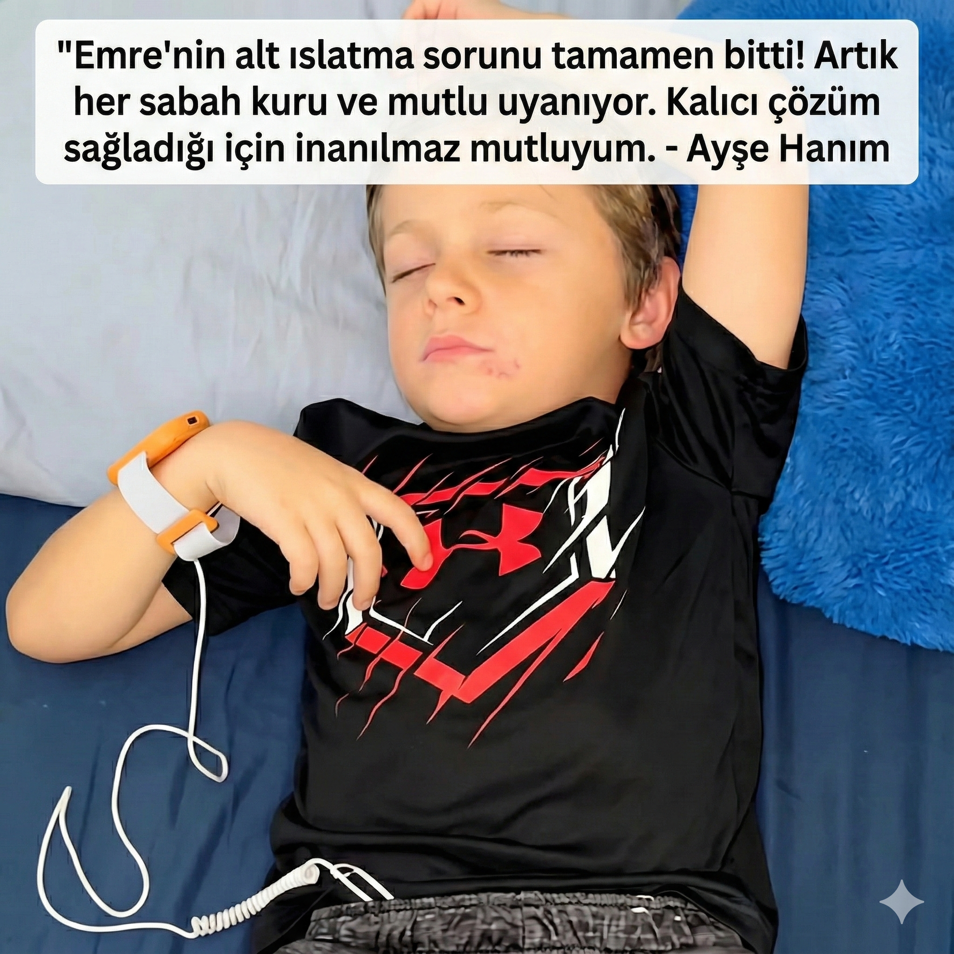 8 yaşındaki çocuğumuz aylardır haftada 3-4 kez yatağını ıslatıyordu. Sıvıları kestik, gece yarısı tuvalete kaldırdık vs. her şeyi denedik. Yılbaşından hemen önce bu reklamı gördüm ve 'bir deneyelim' dedim. Alarmı taktığı ikinci gece bir kaza yaşadı çünkü çarşaflarına dolanmıştı ama onun dışında harika gidiyor. Birkaç hafta önce tatile gittik ve tuvalet çantasına koyduğundan emin olduk. Tatilde bir kez bile takmadı ve SIFIR kaza!!! Teşekkürler!